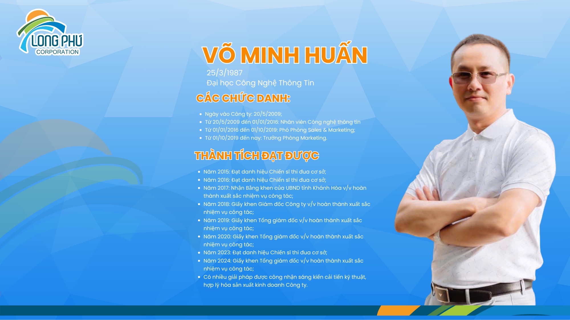 Theo quyết định số 03/NQ-HĐQT-LPC-2025, ông Võ Minh Huấn chính thức được bổ nhiệm giữ chức vụ Phó Giám đốc Công ty cổ phần du lịch Long Phú kể từ ngày 01/7/2025. Với nhiều năm kinh nghiệm trong lĩnh vực Marketing & IT, ông Huấn đã đạt được những thành tích nổi bật và được đánh giá cao về năng lực lãnh đạo, tầm nhìn chiến lược và tinh thần đổi mới sáng tạo.